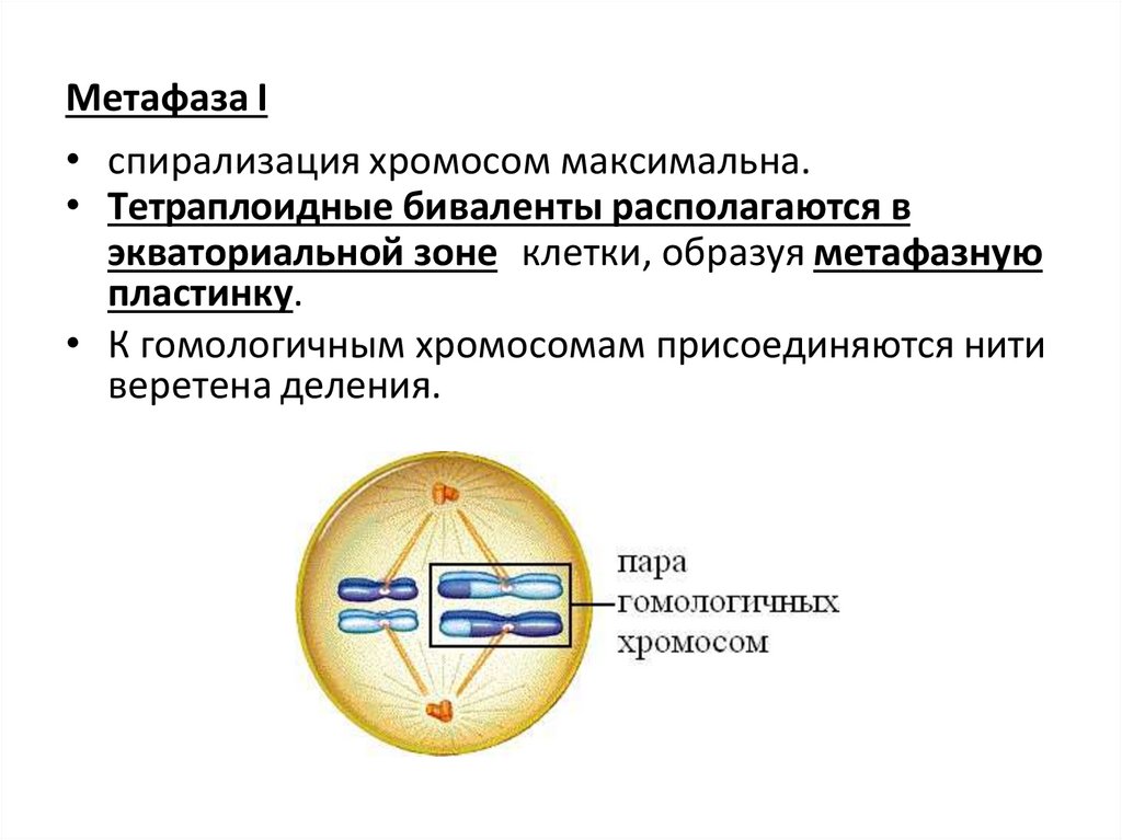 Метафаза I• спирализация хромосом максимальна.
