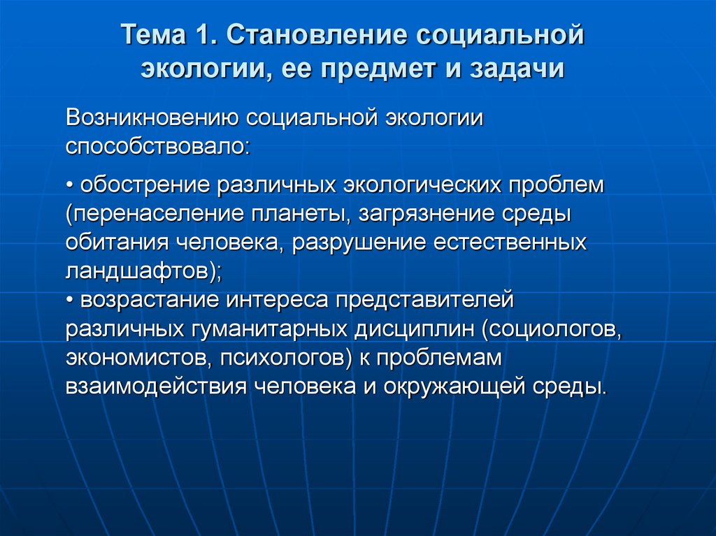 1. Тема 1. Становление социальной экологии, ее предмет и задачи