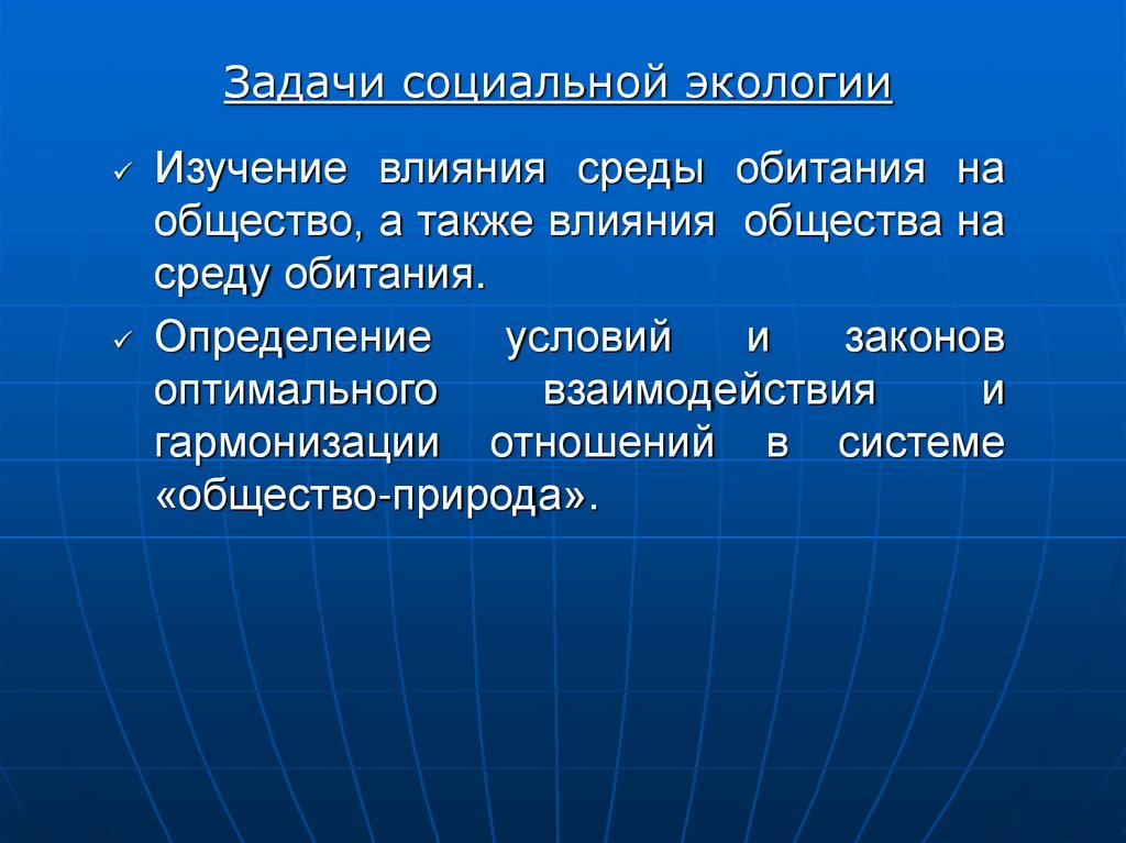 Задачи социальной экологииИзучение влияния среды обитания на