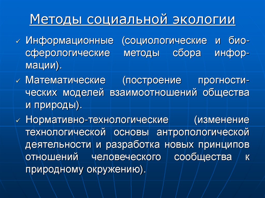 Методы социальной экологииИнформационные (социологические и биосферологические методы сбора информации).