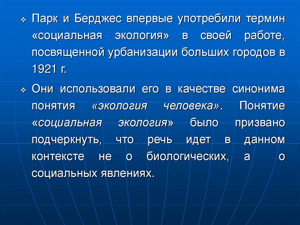 Парк и Берджес впервые употребили термин«социальная экология» в своей работе,