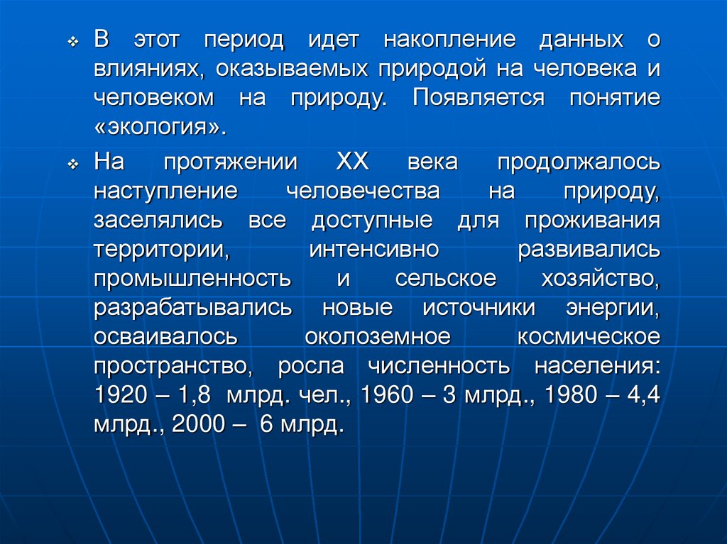 1920 – 1,8 млрд. чел., 1960 – 3 млрд., 1980 – 4,4