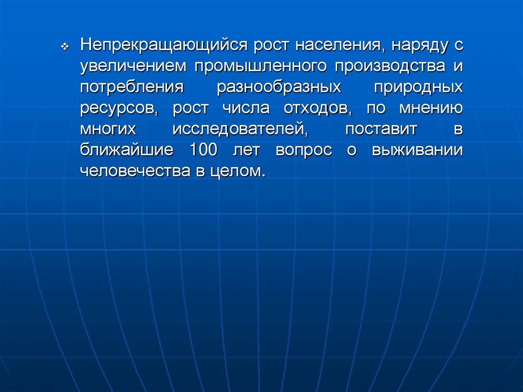 (перенаселение планеты, загрязнение среды
