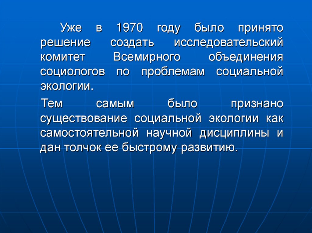 6. Долгое время социальная экология развивалась как экология города. Существенный прогресс в ее развитии произошел в 60-е годы ХХ