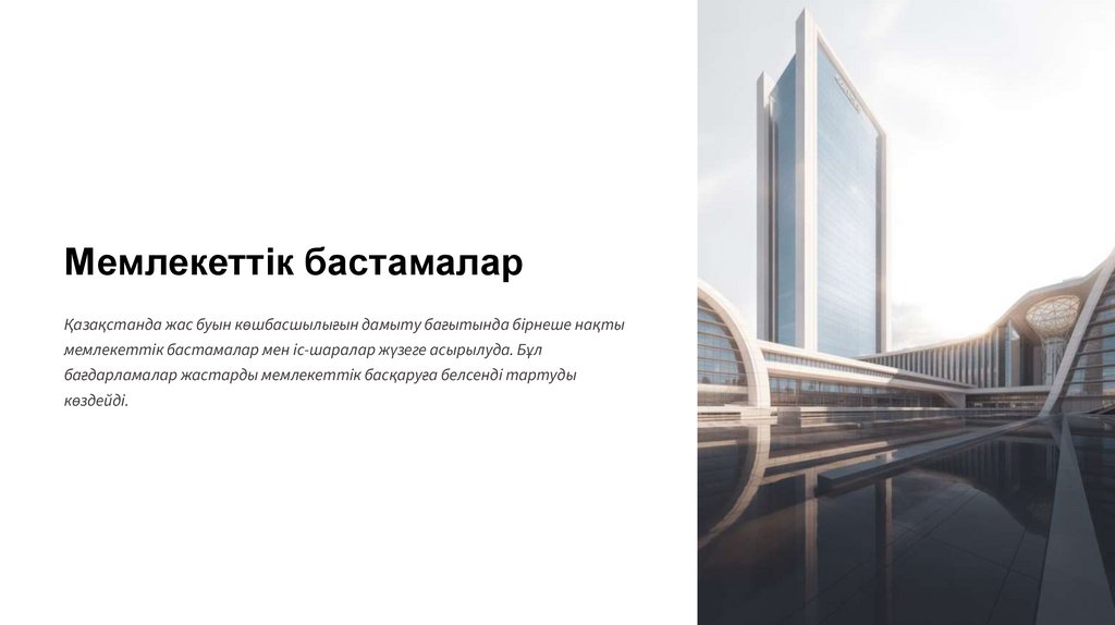 Мемлекеттік бастамаларҚазақстанда жас буын көшбасшылығын дамыту бағытында бірнеше нақты