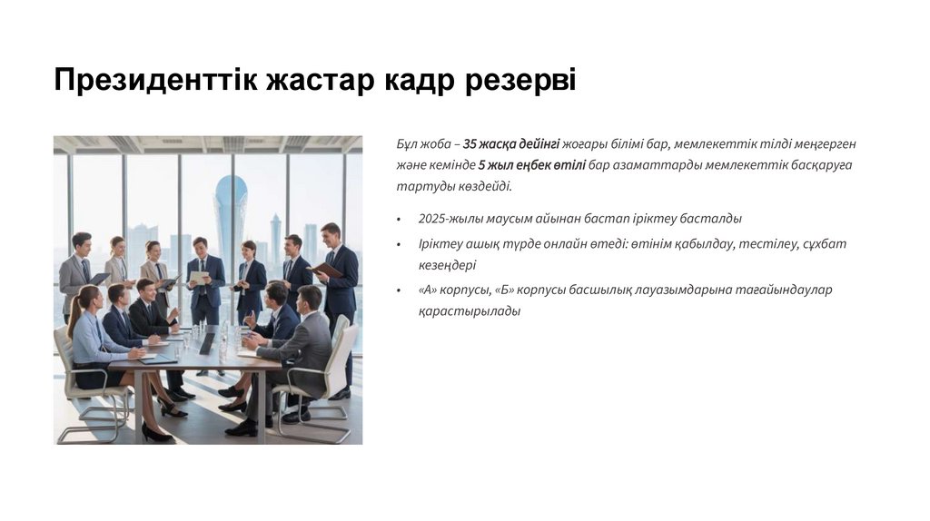 Президенттік жастар кадр резервіБұл жоба – 35 жасқа дейінгі жоғары білімі бар, мемлекеттік тілді меңгерген