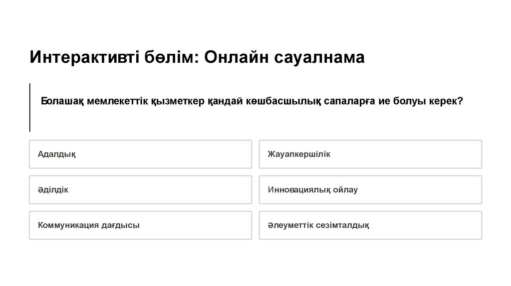 Интерактивті бөлім: Онлайн сауалнамаБолашақ мемлекеттік қызметкер қандай көшбасшылық сапаларға ие болуы керек?