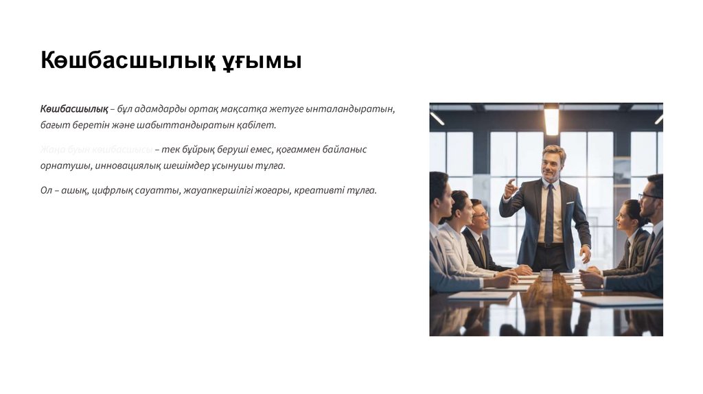Көшбасшылық ұғымыКөшбасшылық – бұл адамдарды ортақ мақсатқа жетуге ынталандыратын,