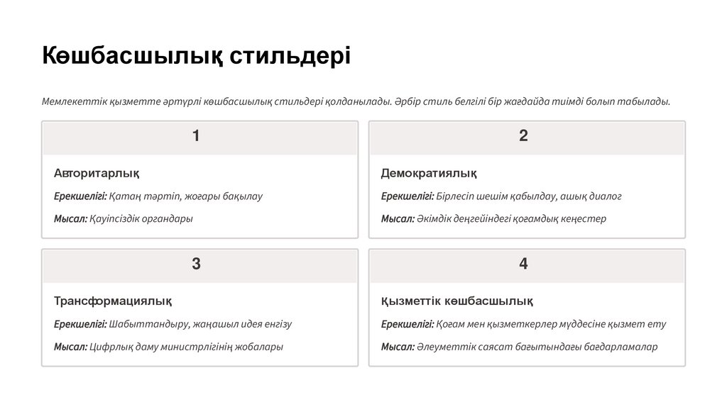 Көшбасшылық стильдеріМемлекеттік қызметте әртүрлі көшбасшылық стильдері қолданылады. Әрбір стиль белгілі бір жағдайда тиімді болып табылады.