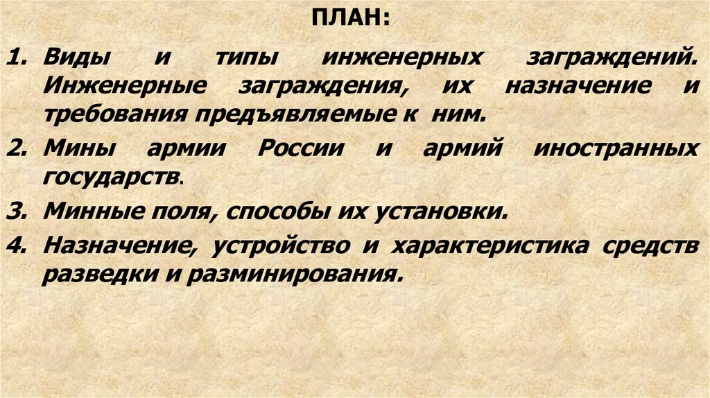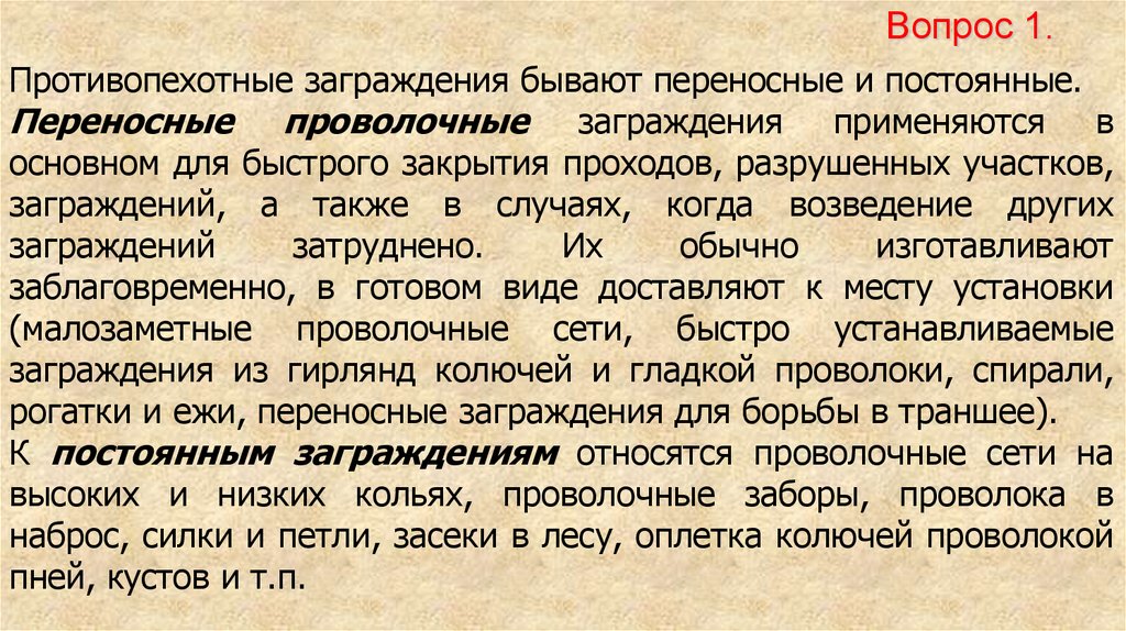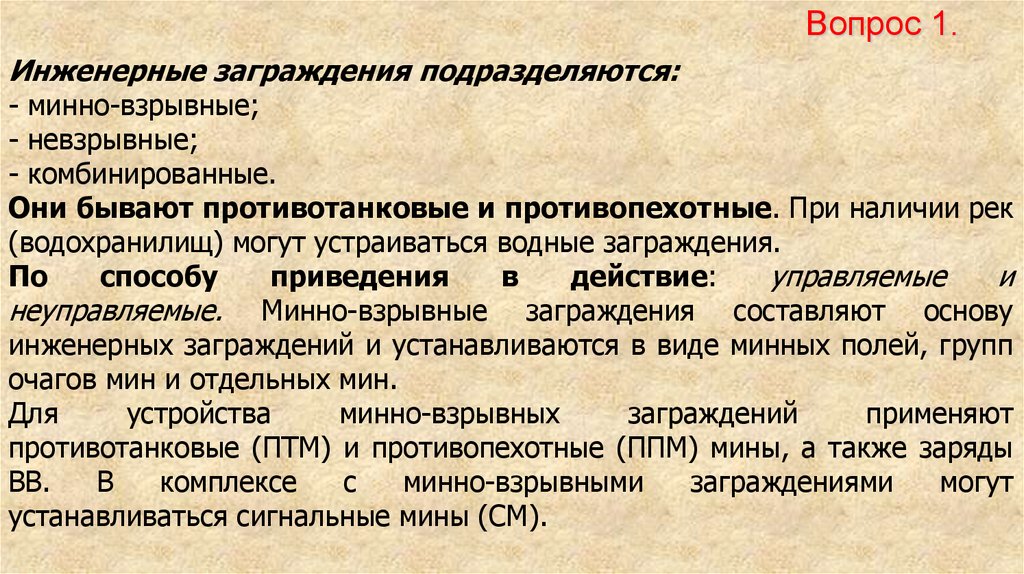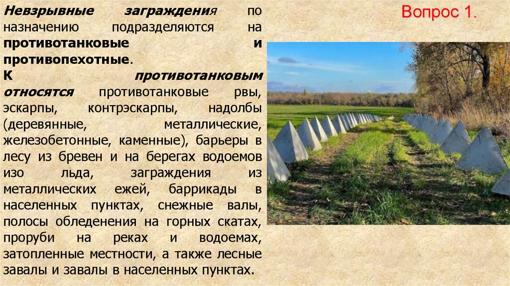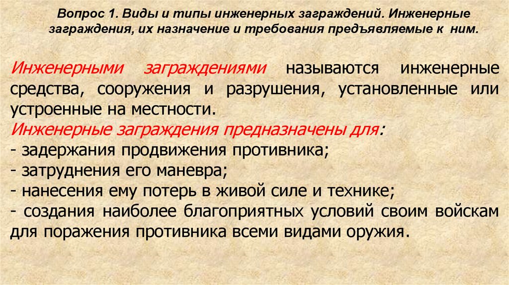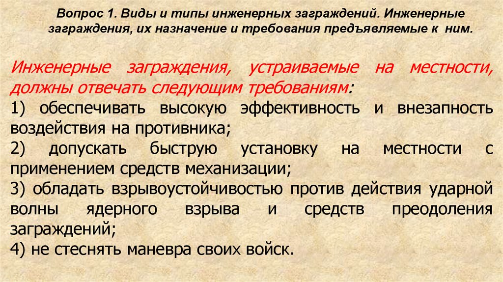 Вопрос 1. Виды и типы инженерных заграждений. Инженерныезаграждения, их назначение и требования предъявляемые к ним.