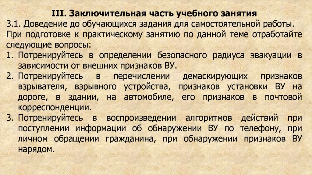 III. Заключительная часть учебного занятия3.1. Доведение до обучающихся задания для самостоятельной работы.