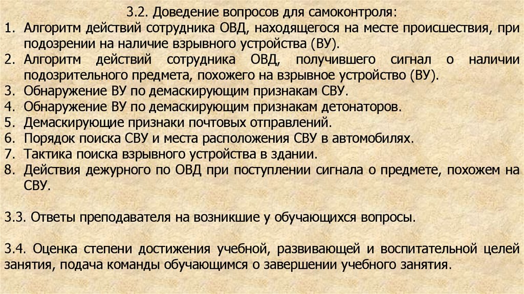 3.2. Доведение вопросов для самоконтроля:1. Алгоритм действий сотрудника ОВД, находящегося на месте происшествия, при