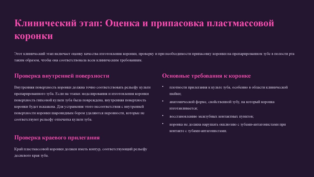 Этот клинический этап включает оценку качества изготовления коронки, проверку и при необходимости припасовку коронки на препарированном зубе в полости рта