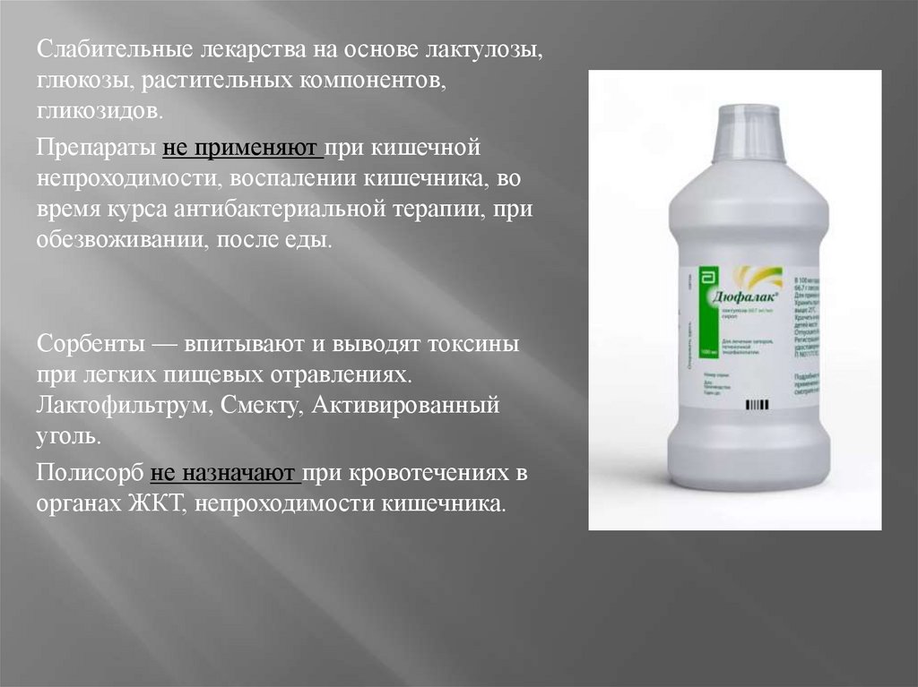 Слабительные лекарства выводят токсические компоненты из желудочнокишечного тракта, облегчая процесс пищеварения. (Дюфалак)