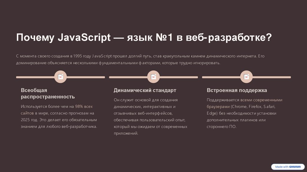 Почему JavaScript — язык №1 в веб-разработке?С момента своего создания в 1995 году J avaS cript прошел долгий путь, став краеугольным камнем динамического интернета. Е го