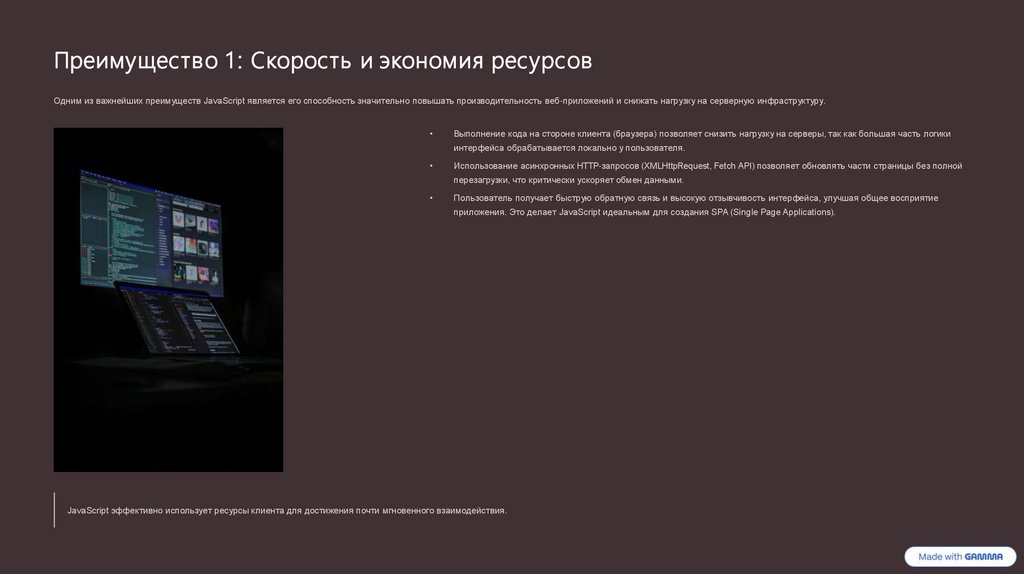 Преимущество 1 : Скорость и экономия ресурсовОдним из важнейших преимуществ JavaScript является его способность значительно повышать производительность веб-приложений и снижать нагрузку на серверную инфраструктуру.