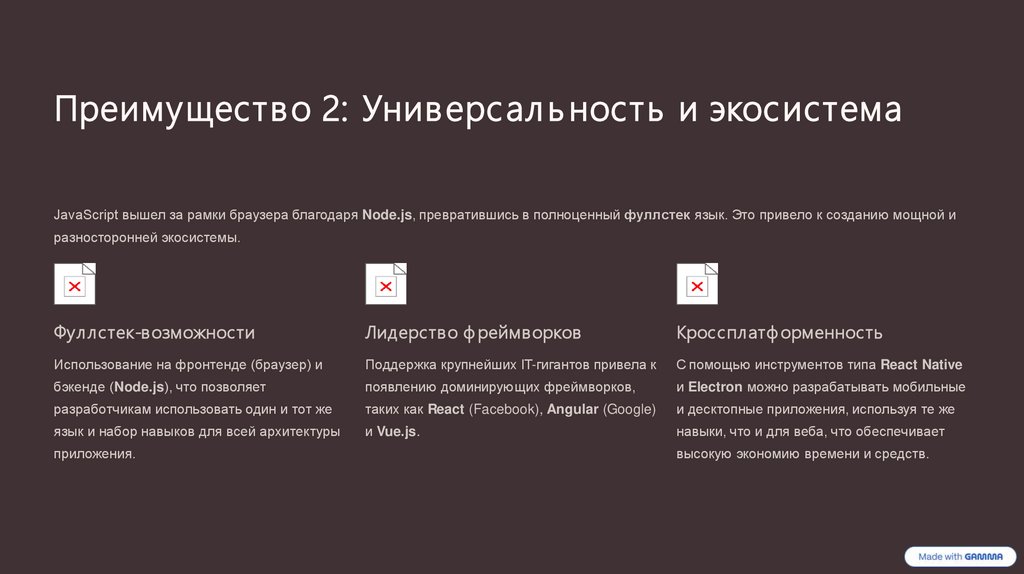 Преимущество 2: Универс ал ь ность и экосистемаJavaScript вышел за рамки браузера благодаря Node.js, превратившись в полноценный фуллстек язык. Это привело к созданию мощной и