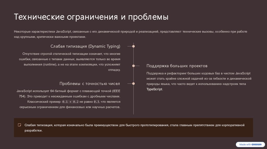 Тех нические ограничения и проблемыНекоторые характеристики JavaScript, связанные с его динамической природой и реализацией, представляют технические вызовы, особенно при работе