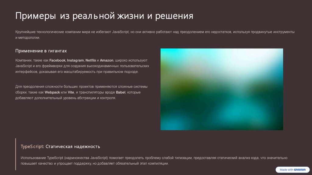 Примеры из реал ь ной жизни и решенияКрупнейшие технологические компании мира не избегают JavaScript, но они активно работают над преодолением его недостатков, используя продвинутые инструменты
