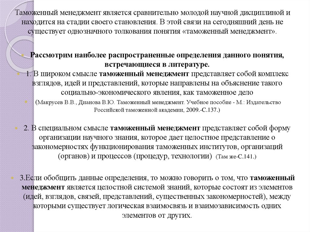 Таможенный менеджмент является сравнительно молодой научной дисциплиной инаходится на стадии своего становления. В этой связи на сегодняшний день не