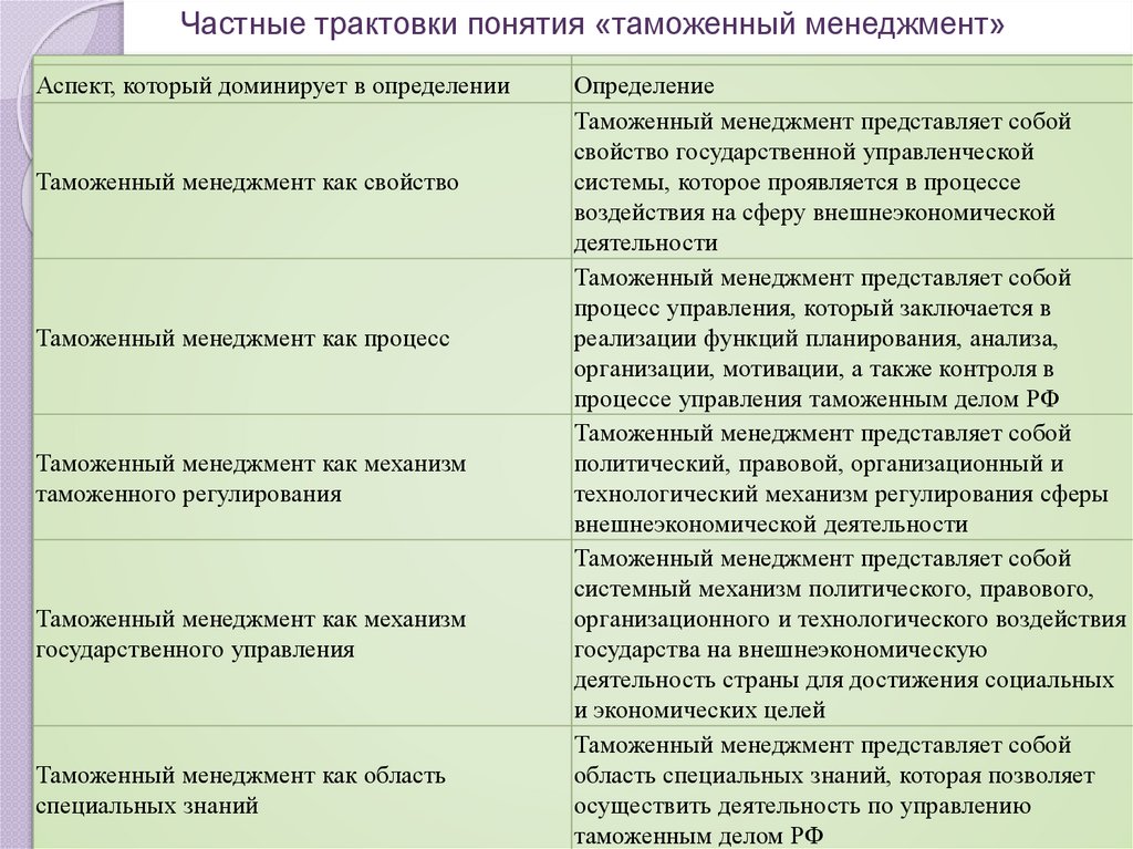 Частные трактовки понятия «таможенный менеджмент»Аспект, который доминирует в определении