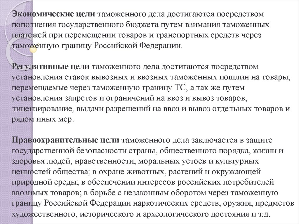 Экономические цели таможенного дела достигаются посредствомпополнения государственного бюджета путем взимания таможенных