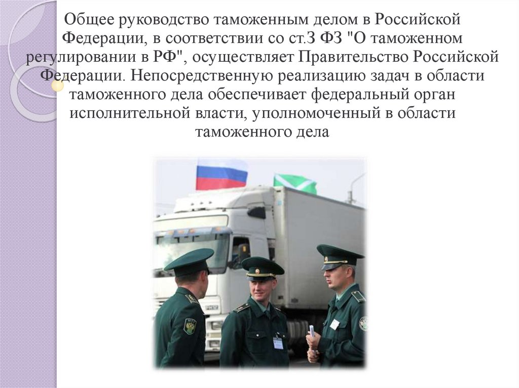Общее руководство таможенным делом в РоссийскойФедерации, в соответствии со ст.З ФЗ "О таможенном