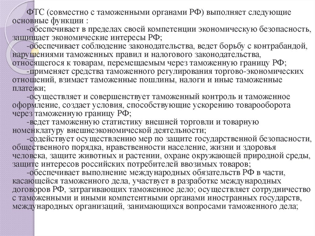 ФТС (совместно с таможенными органами РФ) выполняет следующиеосновные функции :
