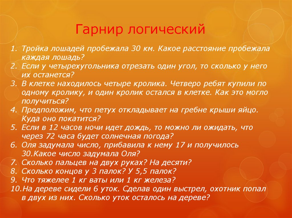 Гарнир логический1. Тройка лошадей пробежала 30 км. Какое расстояние пробежала