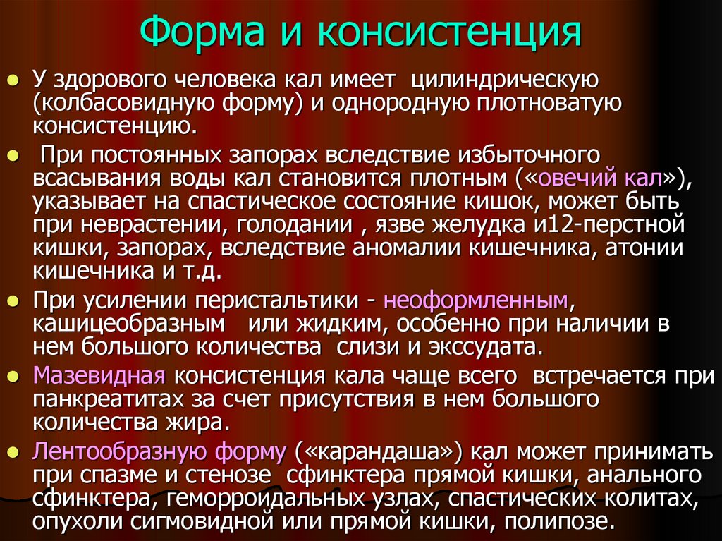 Форма и консистенцияУ здорового человека кал имеет