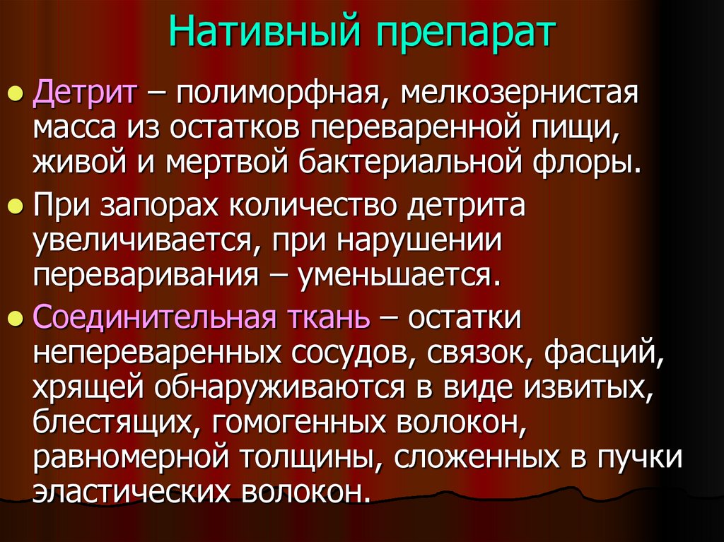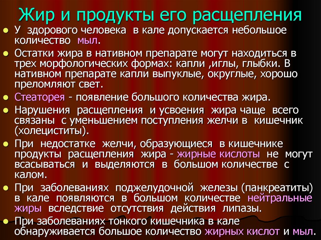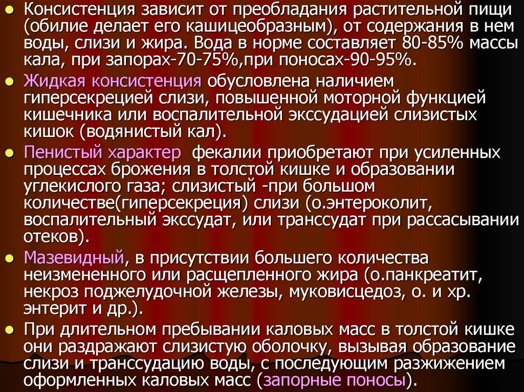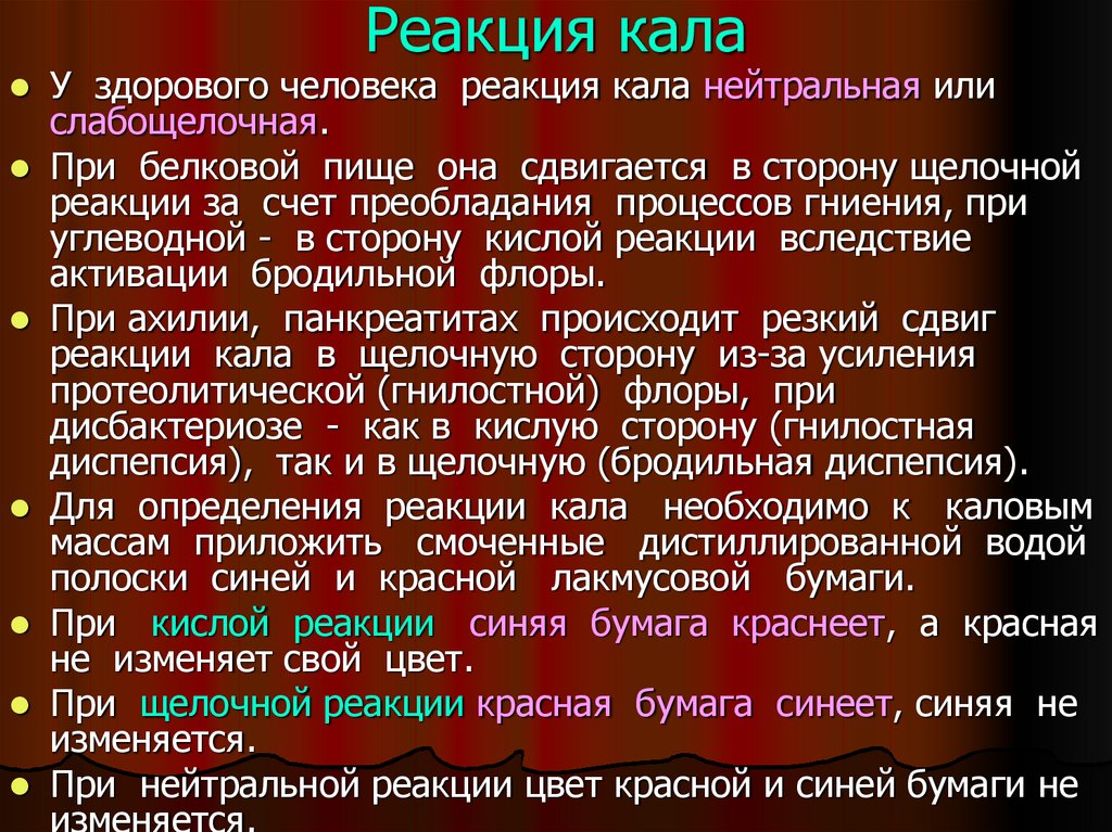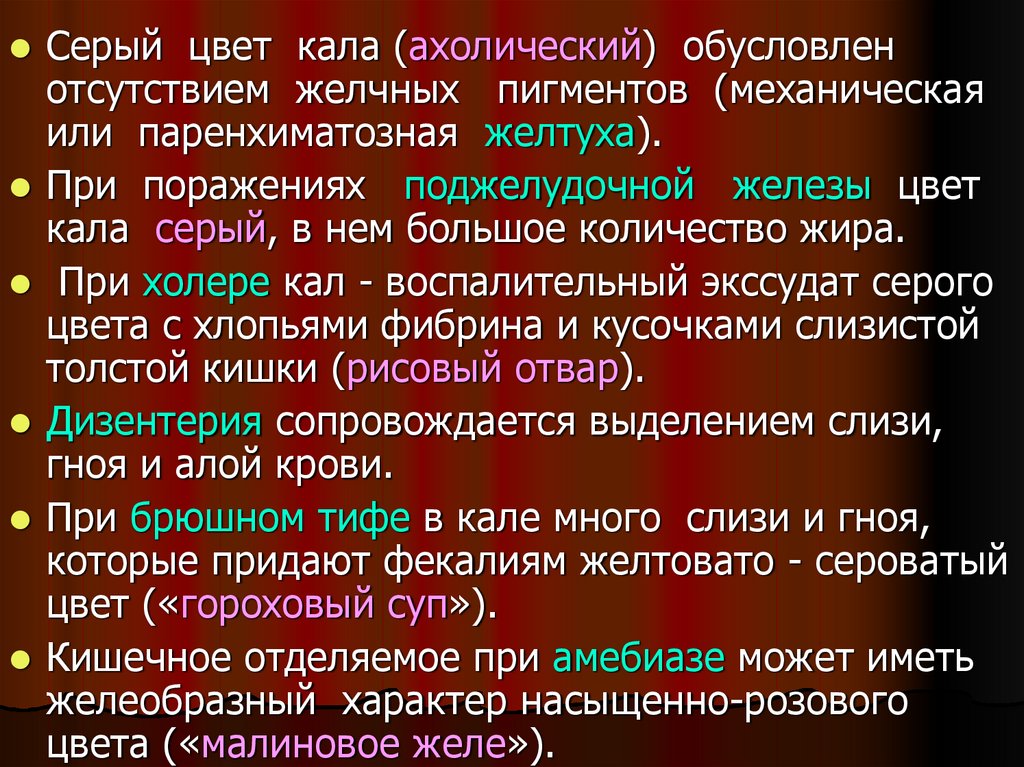 желтого ( молочно-растительная пища), до темнокоричневого (мясная). Изменять цвет кала могут
