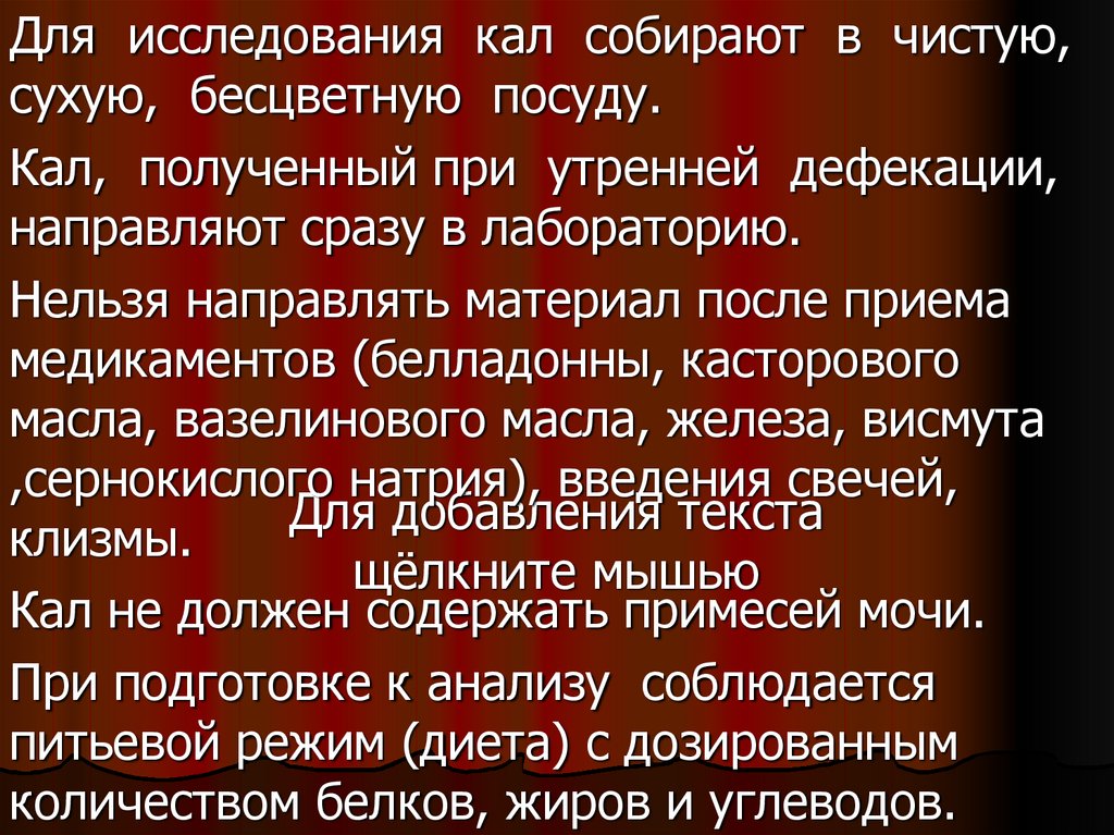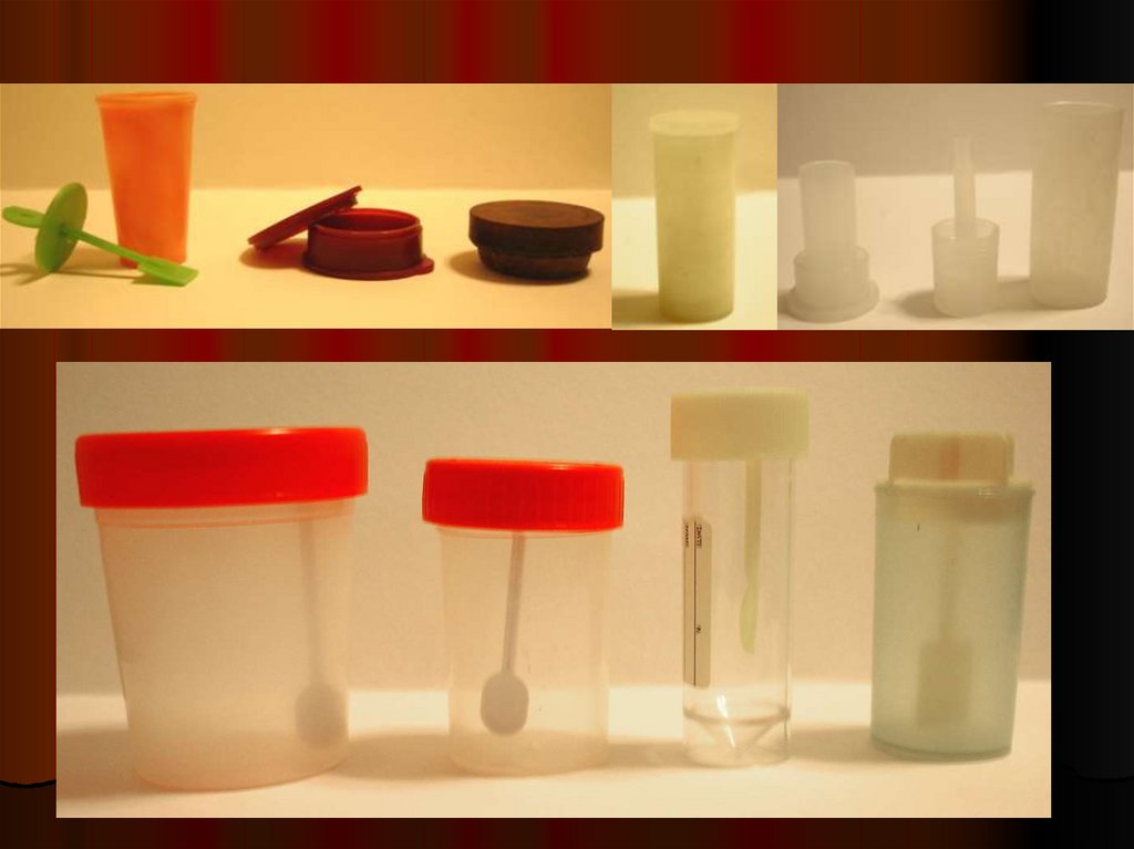 Для исследования кал собирают в чистую,сухую, бесцветную посуду.