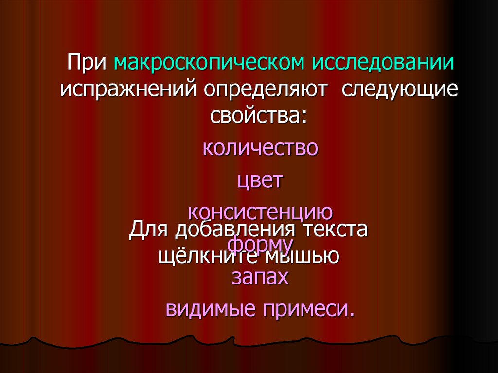 При макроскопическом исследованиииспражнений определяют следующие
