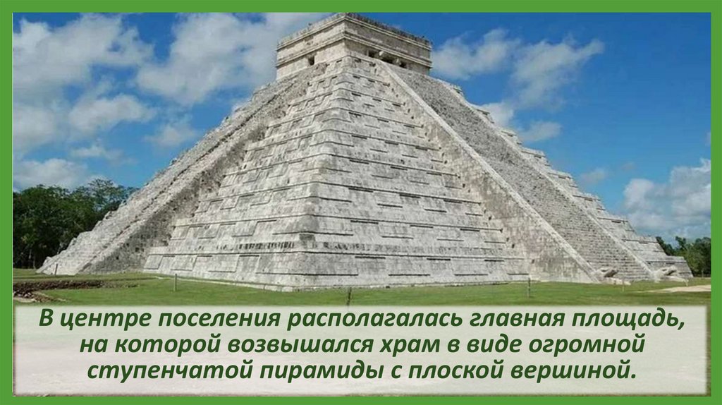 В центре поселения располагалась главная площадь,на которой возвышался храм в виде огромной