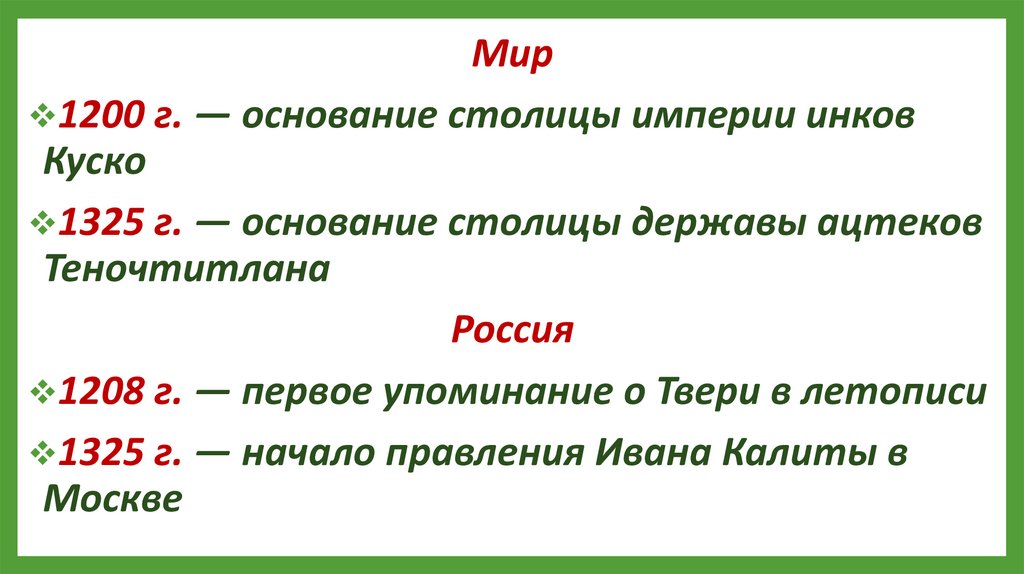 Мир1200 г. — основание столицы империи инков