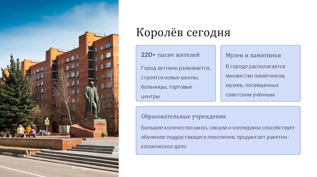 Визуальный облик КоролёваАрхитектура города отражает его двойственную природу: памятники истории соседствуют с современными