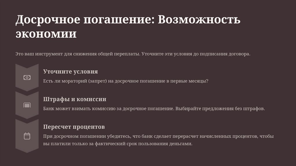 Банк может взимать комиссию за досрочное погашение. Выбирайте предложения без штрафов.