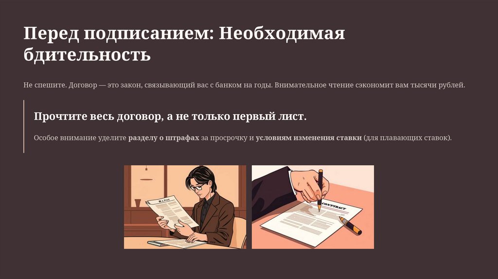 Не спешите. Договор — это закон, связывающий вас с банком на годы. Внимательное чтение сэкономит вам тысячи рублей.