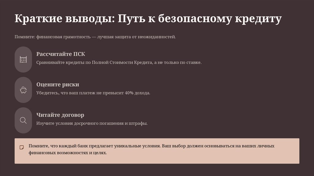 Краткие выводы: Путь к безопасному кредитуПомните: финансовая грамотность — лучшая защита от неожиданностей.