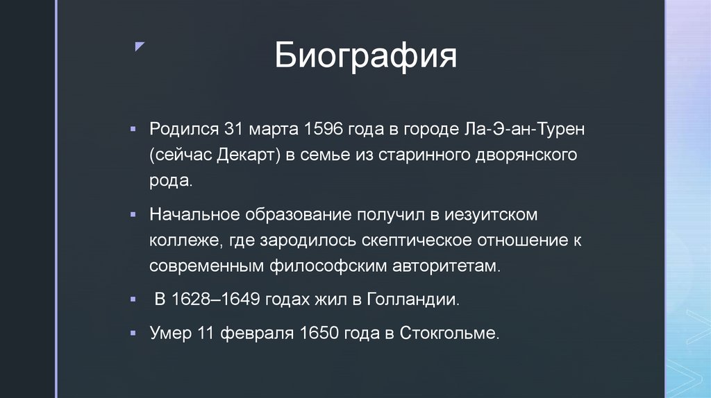 Родился 31 марта 1596 года в городе Ла-Э-ан-Турен