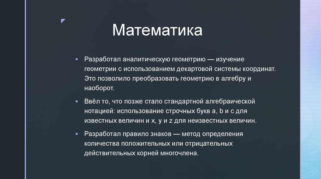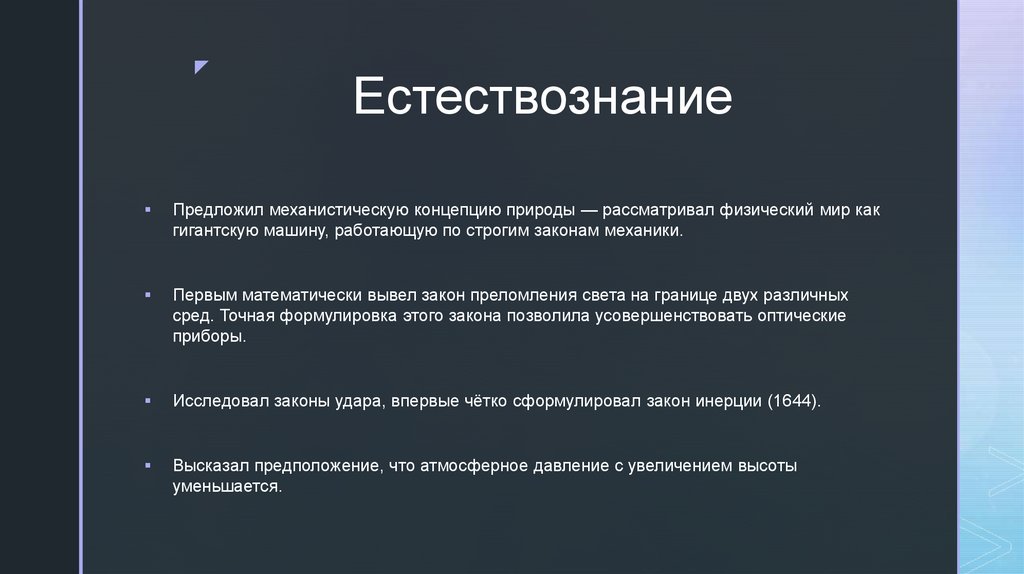 Предложил механистическую концепцию природы — рассматривал физический мир как