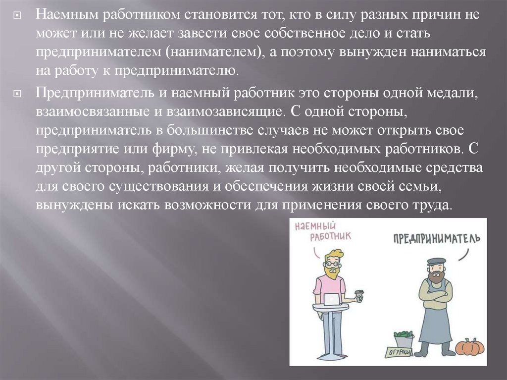 Наемным работником становится тот, кто в силу разных причин неможет или не желает завести свое собственное дело и стать