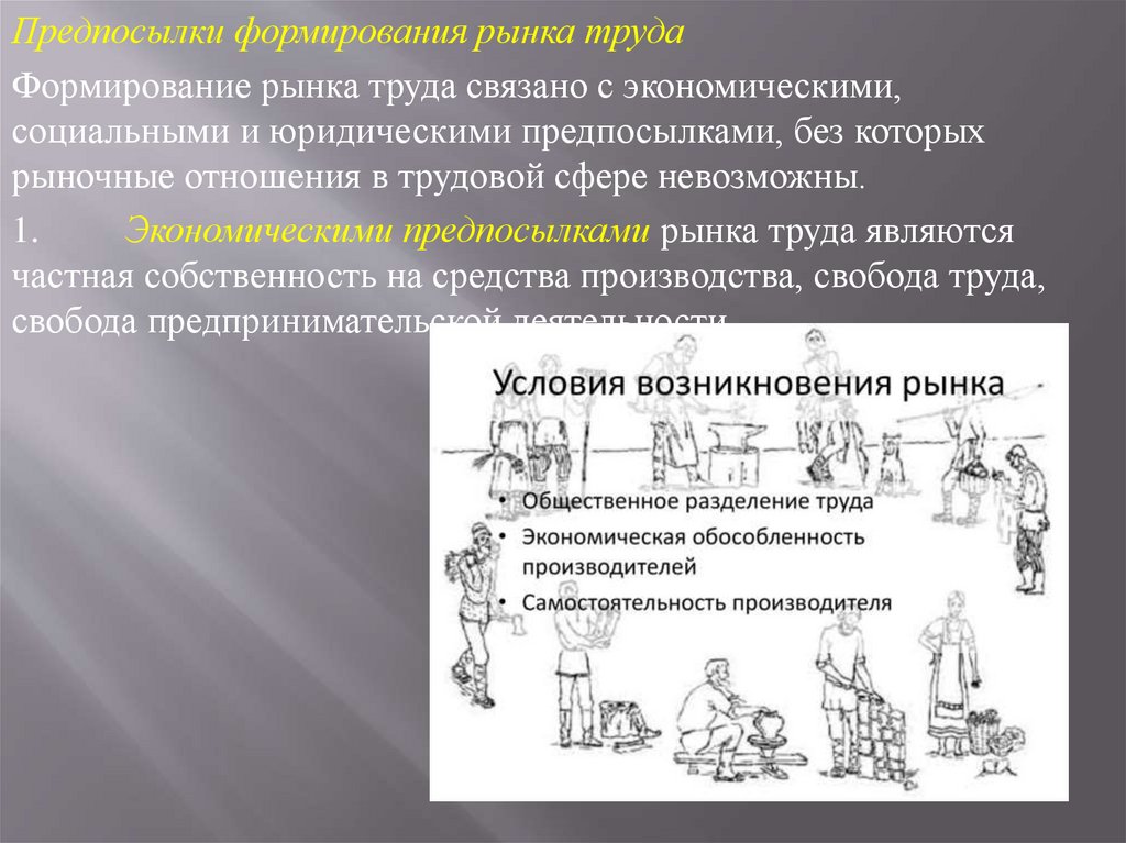 Предпосылки формирования рынка трудаФормирование рынка труда связано с экономическими,