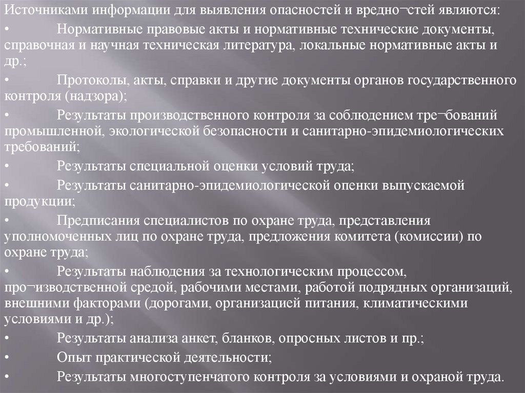 Источниками информации для выявления опасностей и вредно¬стей являются:Нормативные правовые акты и нормативные технические документы,