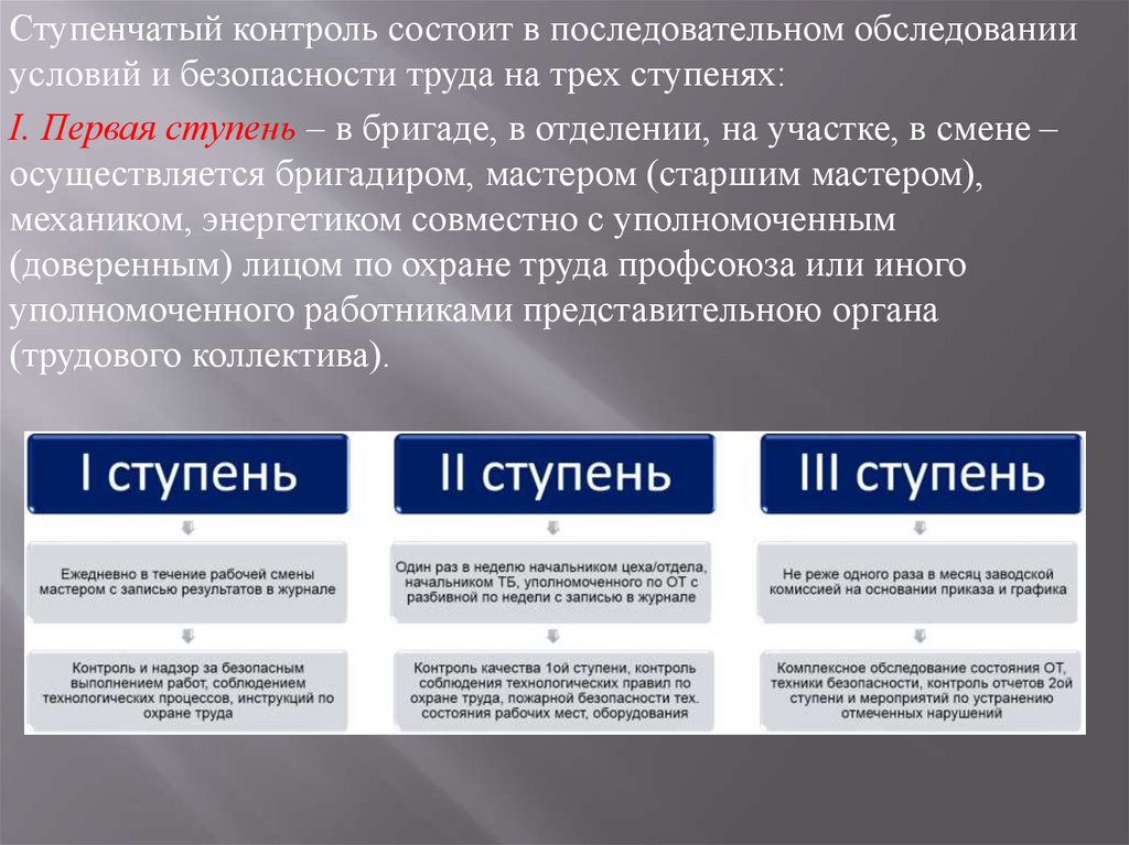 Ступенчатый контроль состоит в последовательном обследованииусловий и безопасности труда на трех ступенях: