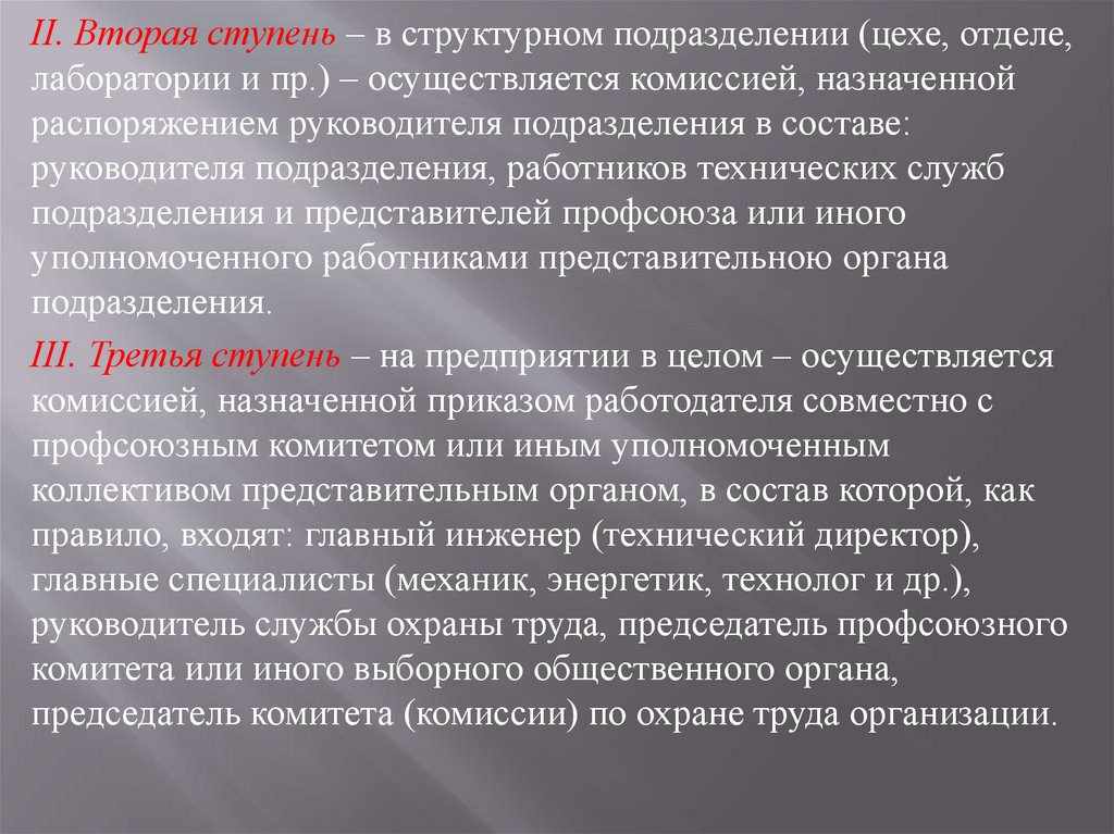 II. Вторая ступень – в структурном подразделении (цехе, отделе,лаборатории и пр.) – осуществляется комиссией, назначенной