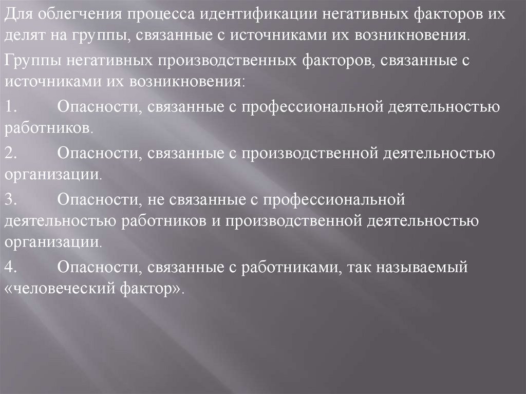 Для облегчения процесса идентификации негативных факторов ихделят на группы, связанные с источниками их возникновения.