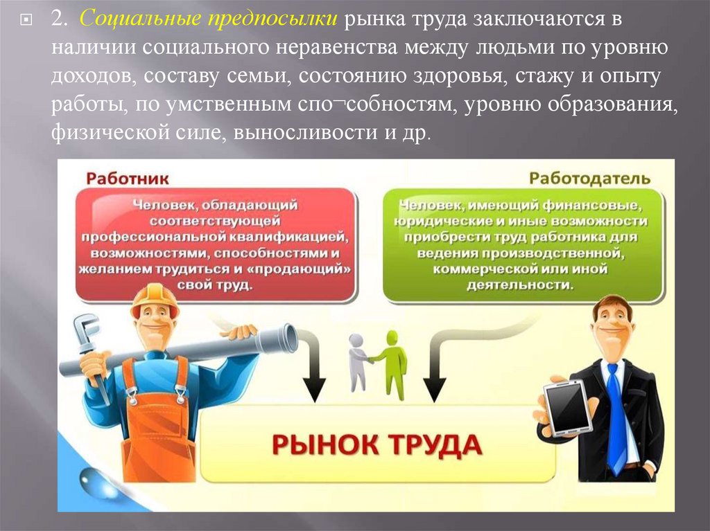 2. Социальные предпосылки рынка труда заключаются вналичии социального неравенства между людьми по уровню