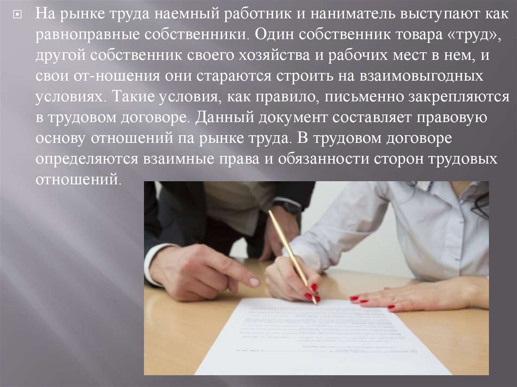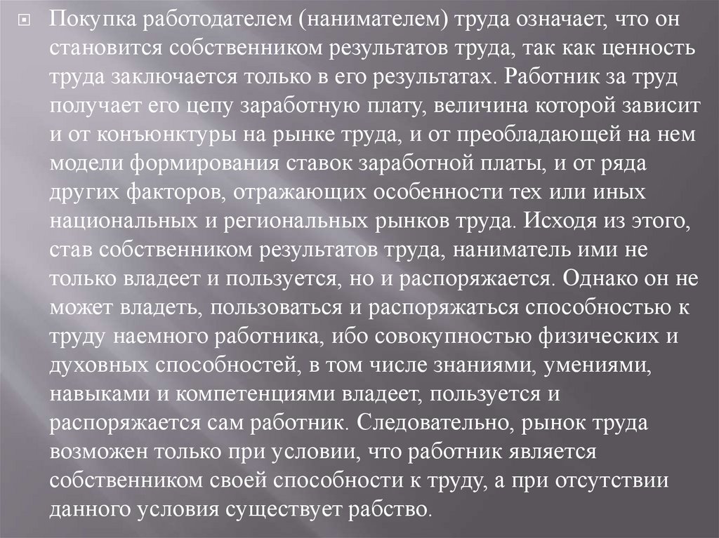 На рынке труда наемный работник и наниматель выступают какравноправные собственники. Один собственник товара «труд»,
