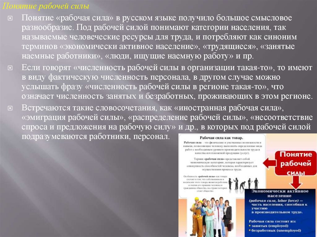 Понятие рабочей силыПонятие «рабочая сила» в русском языке получило большое смысловое
